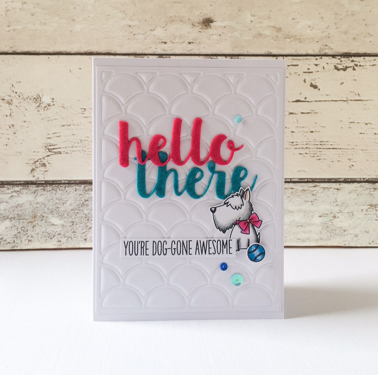 using the Dainty Scallop Coverup die (MFT) to act as an embossing plate. I've teamed this with the Lucky Dog set and the die cut sentiment is using the fabulous felt
