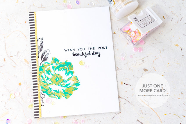 I think for me, the color combination and the stripes are what makes this card “modern”: the gold over the fresh mint color is just something that I can’t associate with traditional color schemes. And the thin patterned paper strip really adds contrast to the otherwise very simple and clean design.
