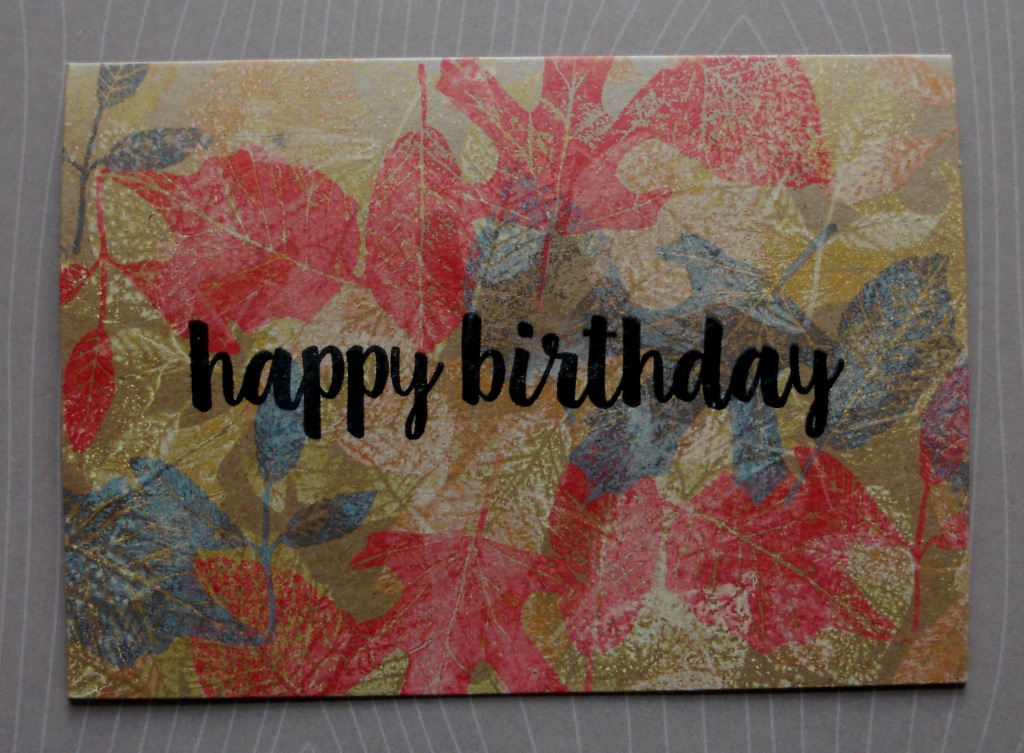 First off I reached for that stunning leaf border and I wanted to fill a card with it. I stamped it several times onto kraft using distress oxide inks starting with yellows working through orange, reds and browns. I've found if you layer these inks over each other whilst they are still wet your get a gentle oxide effect which works well for autumn leaves. Once dry I just added a simple bold sentiment over the top - I went with birthday but I think autumn leaves would make good sympathy cards too.