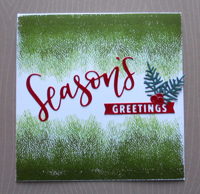 I just stamped the pine border in 3 shades of MFT green ink at the top and bottom of the card to get a lush green border and then used the complimentary die in red mirri card for a spot of seasonal sparkle on the sentiment.