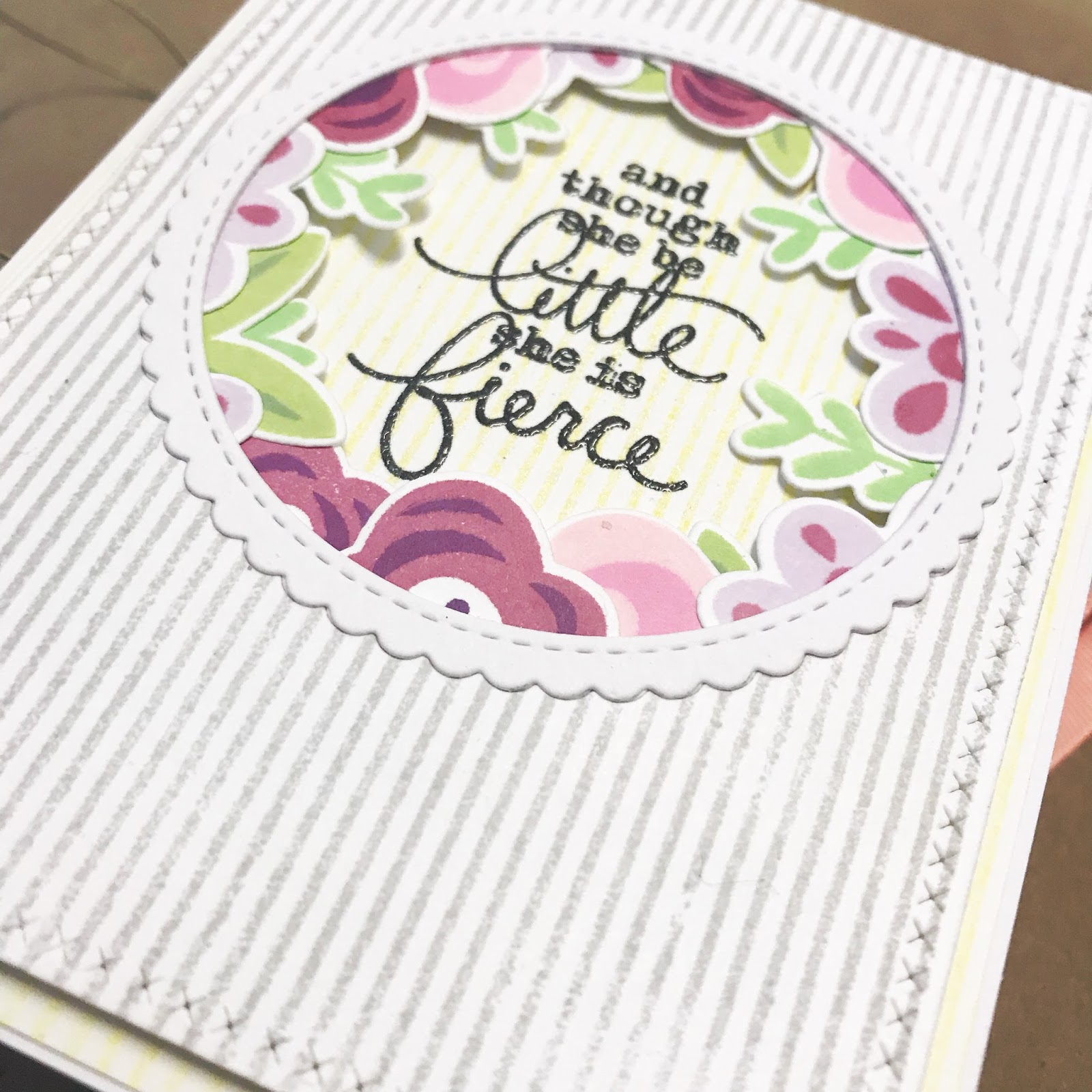 I stamped the same Pinstripe Background out again in a pale lemon onto a piece of card to have as my back piece, and stamped onto it this awesome empowering sentiment from Mama Elephant's Everyday Greetings so that it would be centred behind my aperture.