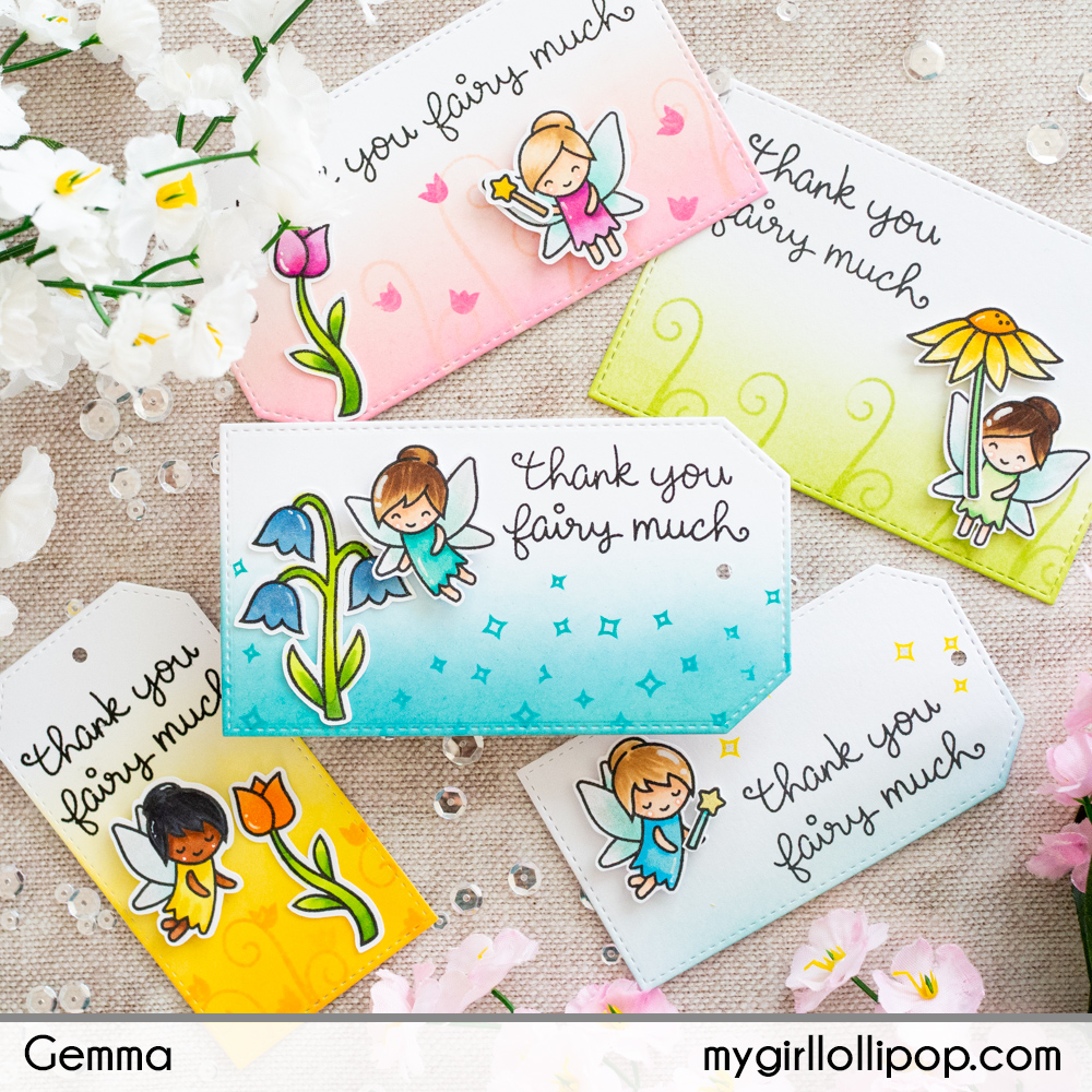 I blended some ombré colour on to the tags, then stamped the sentiment from the Fairy Friends set with black ink. I added the die cut images to the tags, using foam tape for the fairies.