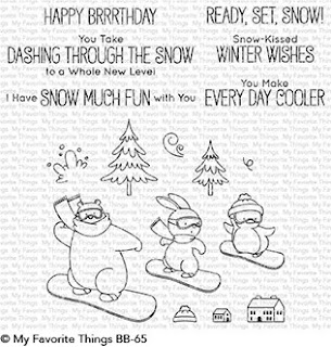 Hello, Tallie here. I won't get to visit the slopes this year so here's a frosty themed birthday card featuring the MFT Ready, Set, Snow stamp set. This one is for my brother, who unlike me, will shortly be visiting the snowy slopes!