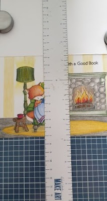 I just layed my stamps on the front of the card, layering them on top of each other so I could work out my rough layout, and then set to work on masking. I only needed a mask for the fox in his chair and the little table so I stamped them on post-its and cut them out. I stamped the fox, masked him, stamped the table, masked that and then stamped the lamp and fireplace. With masking you just have to remember to start with the foreground image and work backwards.
