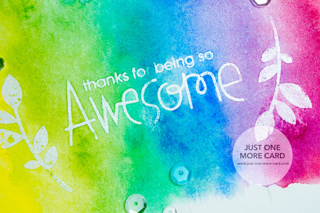 I started by using my anti-static tool on my card and then heat embossing a Paper Smooches sentiment and a leaf image in the center of my card. The heat embossing will resist watercolors, and I find it easier to do this first so I won't have to wait for my watercolors to dry later on.