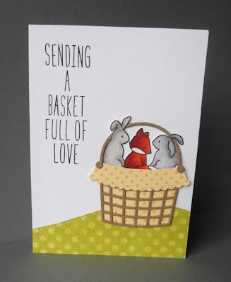 I die cut the basket from kraft and the inner bit and frill from the sorbet pack of papers from MFT. I stamped the baby animals from Mama Elephant's New Family set onto white card and coloured with copics before fussy cutting. They were then popped into the basket before finishing the card with a grassy hill and a sentiment made up with Milo's ABCs. If I'd just done bunnies I could see this being a great take on Easter cards - those baby animals have uses way beyond new baby cards ;-)